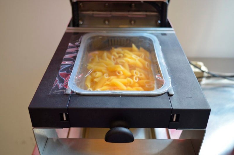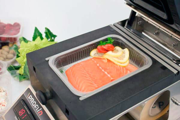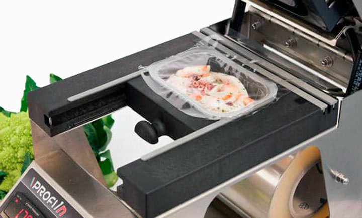 Зварювач лотків Orved Profi 1N запаевает продукти в лотки спеціальної термостійкої плівкою.