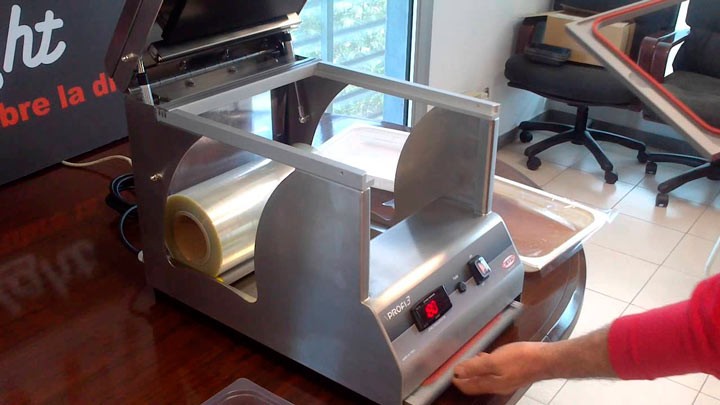 Зварювач лотків Orved Profi 3 запаевает продукти в лотки спеціальної термостійкої плівкою.