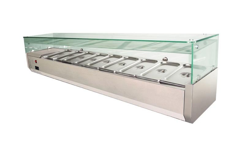 Настольная холодильная витрина CustomCool CCSTG-1800 прекрасно подходит для кратковременного хранения и демонстрации, предварительно охлажденных продуктов (салатов, закусок, гарниров) в магазинах, кафе, барах, ресторанах, суши-барах. Наиболее широко применяются в пиццериях для хранения топпинга (начинки для пиццы).