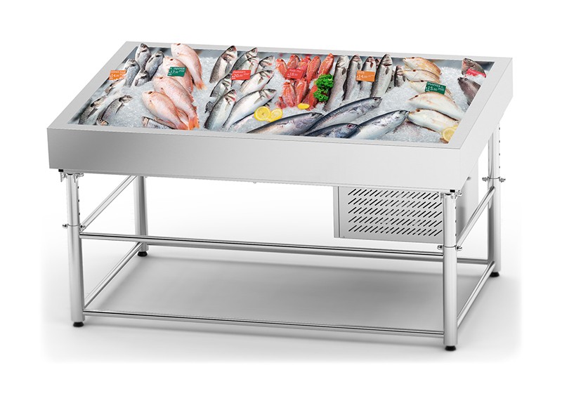 Холодильный стол Orest SDIC-1.1/1.0 используют для кратковременного хранения и демонстрации рыбы и морепродуктов на предприятиях торговли и общественного питания