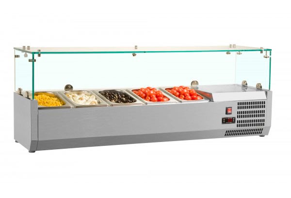Настольная холодильная витрина EFC VRX1200/330FG прекрасно подходит для кратковременного хранения и демонстрации, предварительно охлажденных продуктов (салатов, закусок, гарниров) в кафе, барах, ресторанах, точках продажи шаурмы. Наиболее широко применяются в пиццериях для хранения топпинга (начинки для пиццы).