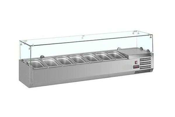 Настольная барная холодильная витрина VRX1500/380 прекрасно подходит для кратковременного хранения и демонстрации, предварительно охлажденных продуктов (салатов, закусок, гарниров) в магазинах, кафе, барах, ресторанах, суши-барах. Наиболее широко применяются в пиццериях для хранения топпинга (начинки для пиццы).