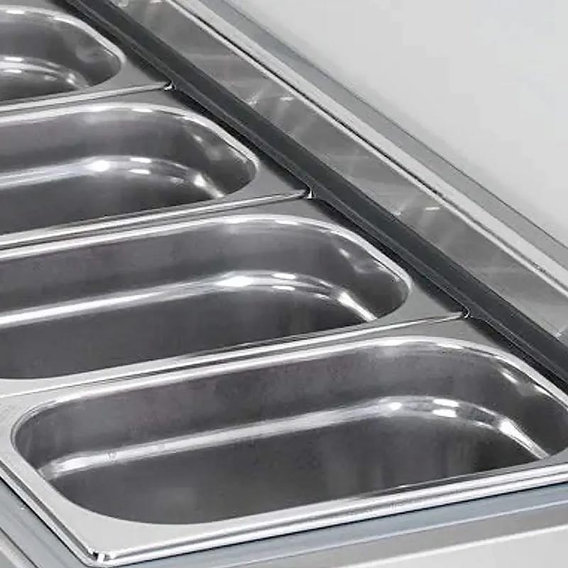 Настольная холодильная витрина GGM Gastro AGG153ND прекрасно подходит для кратковременного хранения и демонстрации, предварительно охлажденных продуктов (салатов, закусок, гарниров) в магазинах, кафе, барах, ресторанах, суши-барах. Наиболее широко применяются в пиццериях для хранения топпинга (начинки для пиццы).