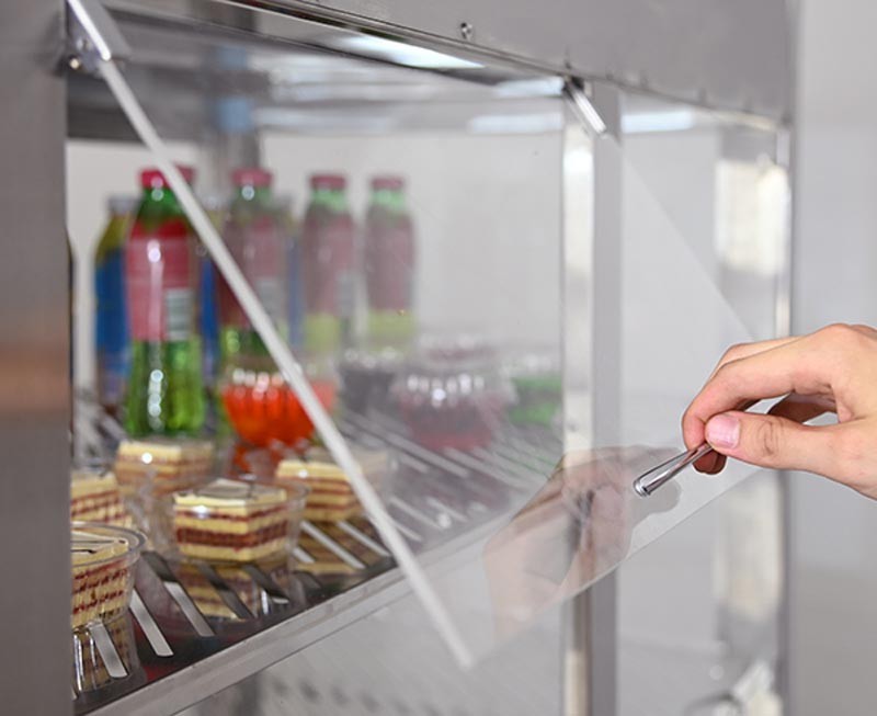 Поднимающиеся дверцы витрины обеспечивают удобное извлечение блюд, что позволяет использовать весь объёмом камеры без общей потери холода.