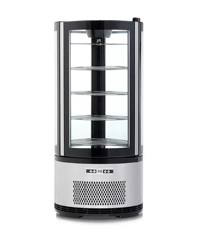 Кондитерская настольная холодильная витрина Berg FT-100R-1 прекрасно подходит для демонстрации выпечки, тортов, пирожных. Панорамное сферическое стекло и вращающиеся полки с подсветкой представляют товар с наилучшей стороны.