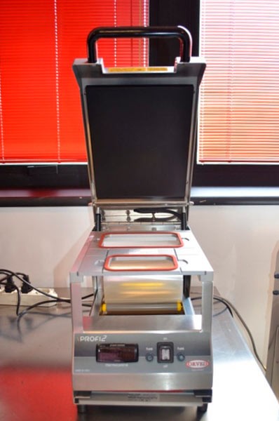 Запайщик лотков Orved Profi 2 запаевает продукты в лотки специальной термостойкой пленкой.