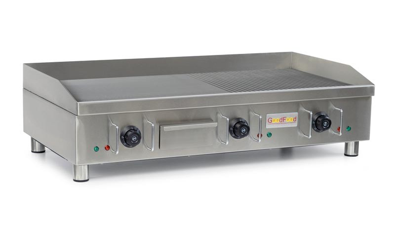 Жарочная поверхность GoodFood EG90FR — профессиональное тепловое оборудование для жарки мяса, рыбы, овощей и полуфабрикатов на кухнях ресторанов, кафе, столовых и заведений быстрого питания. Модель с комбинированной рабочей поверхностью обеспечивает аппетитную корочку и характерный рисунок гриля без использования лишнего жира.